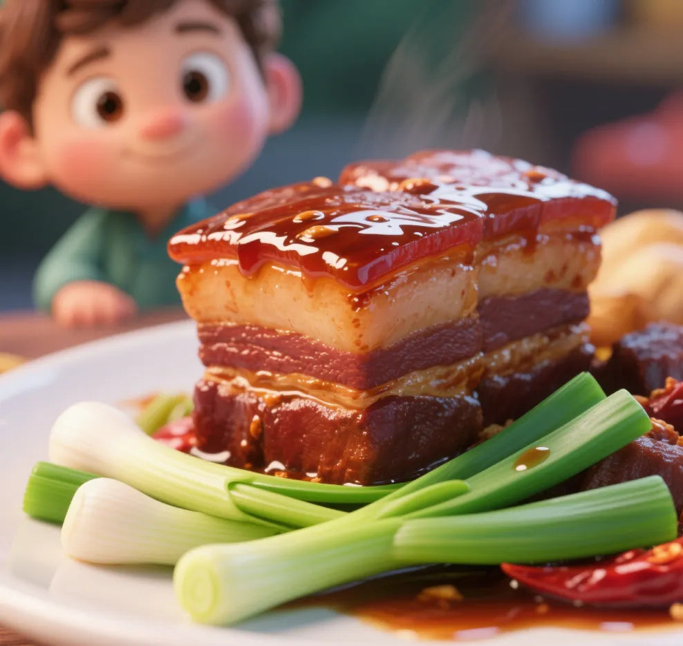 In Shanghai, the dish is called "Ben Bang Hong Shao Rou." The sauce is rich and dark, with a sweet flavor.In places like Hunan, people add a little spicy flavor. This is known as "Mao's red-braised pork." It has a mix of sweet, salty, and spicy flavors, making it very tasty!